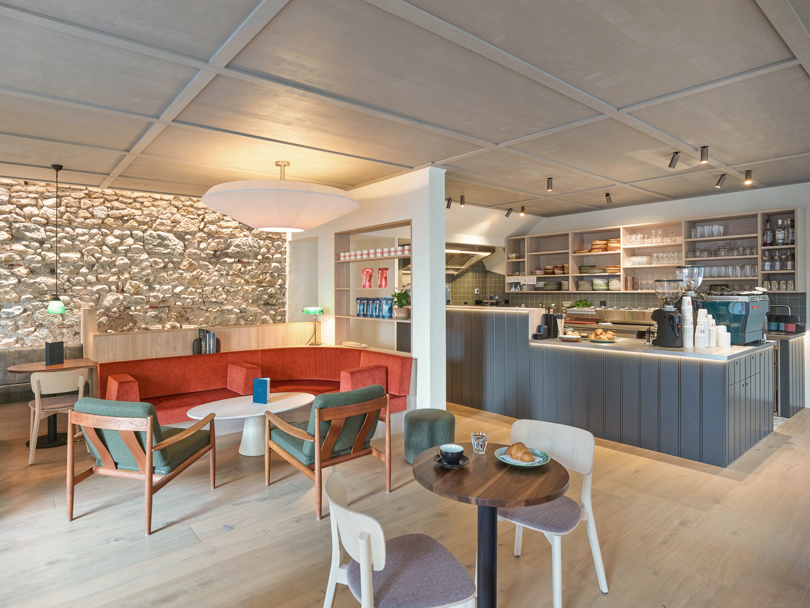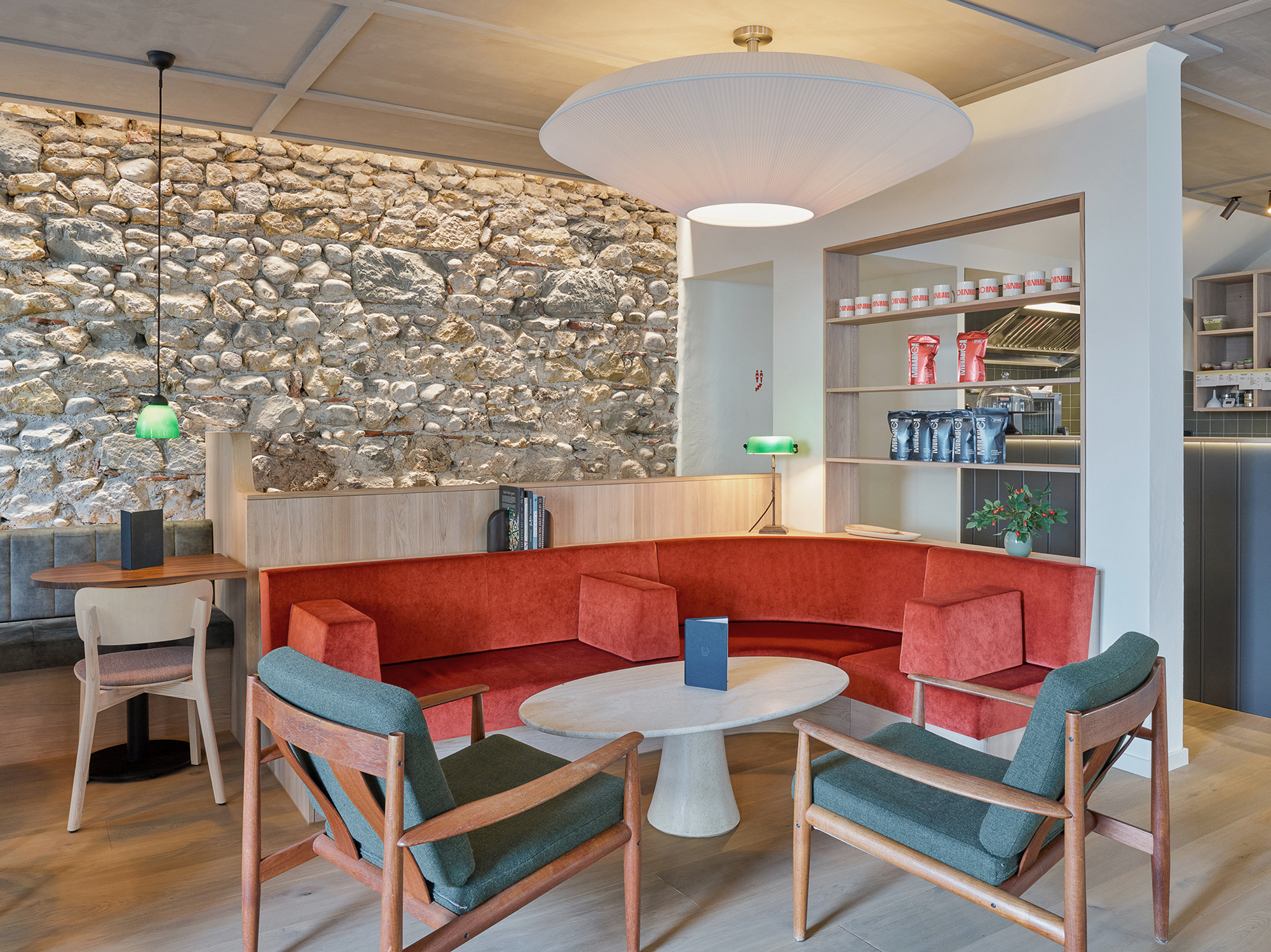 Die Akustikdecke im Stil einer barocken Holzdecke, das ausgeklügelte Beleuchtungskonzept und die bequemen Polsterbänke entlang der Wände sorgen für eine angenehme Raumatmosphäre. Das neue, vergrösserte Buffet ist Produktionsstätte für das reichhaltige Frühstücksangebot und präsentiert das Herzstück des Cafés: ‘la Marzocco’, Königin der Kaffeemaschinen.