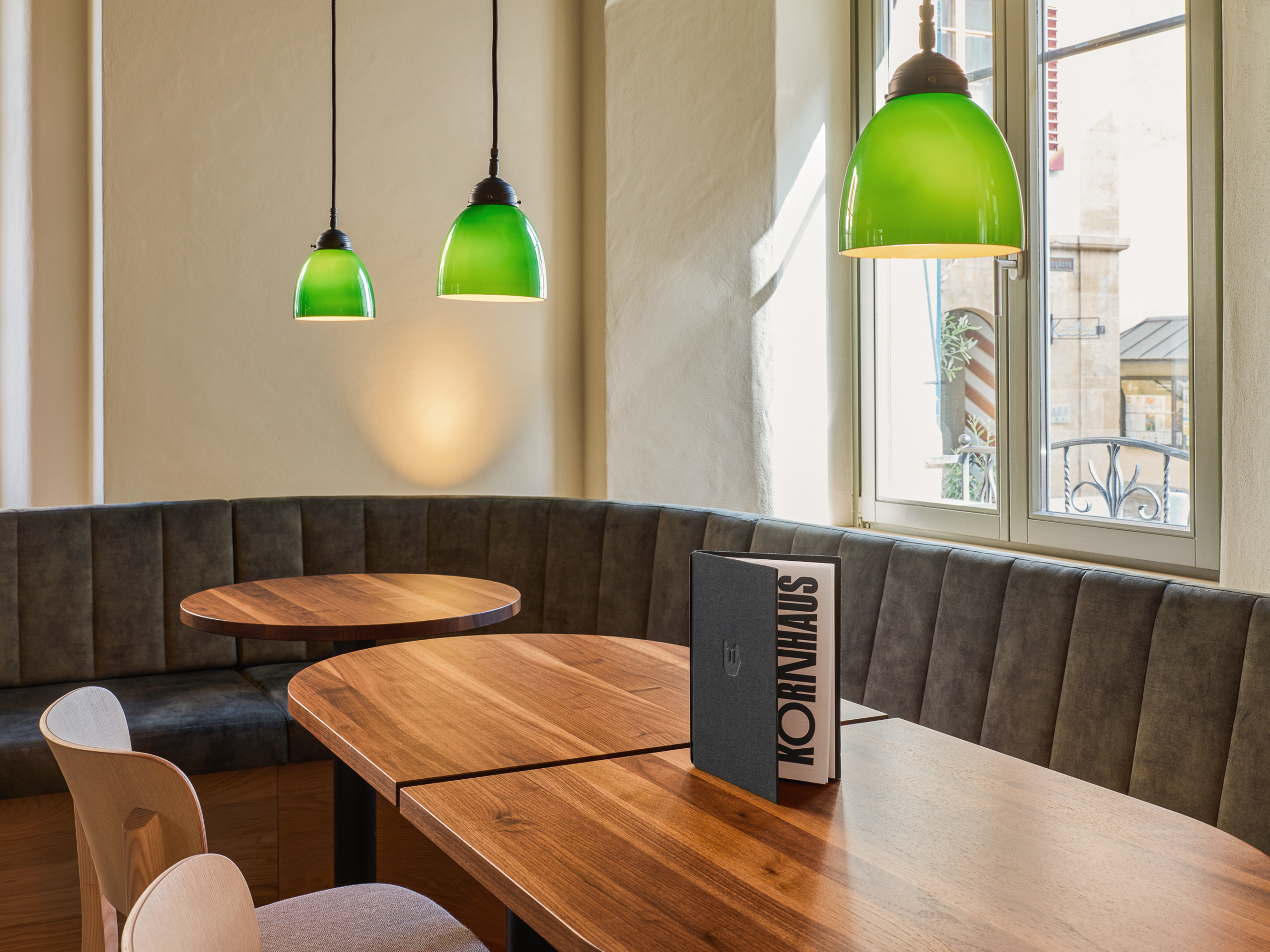 Durch einen Windfang aus Glas betritt man den Gastraum. Der Innenausbau ist klassisch und zurückhaltend, die Materialien sind zeitlos und wertig. Der Boden, die Einbauten und die Möbel kombinieren auf unkonventionelle Weise verschiedene Holzarten.