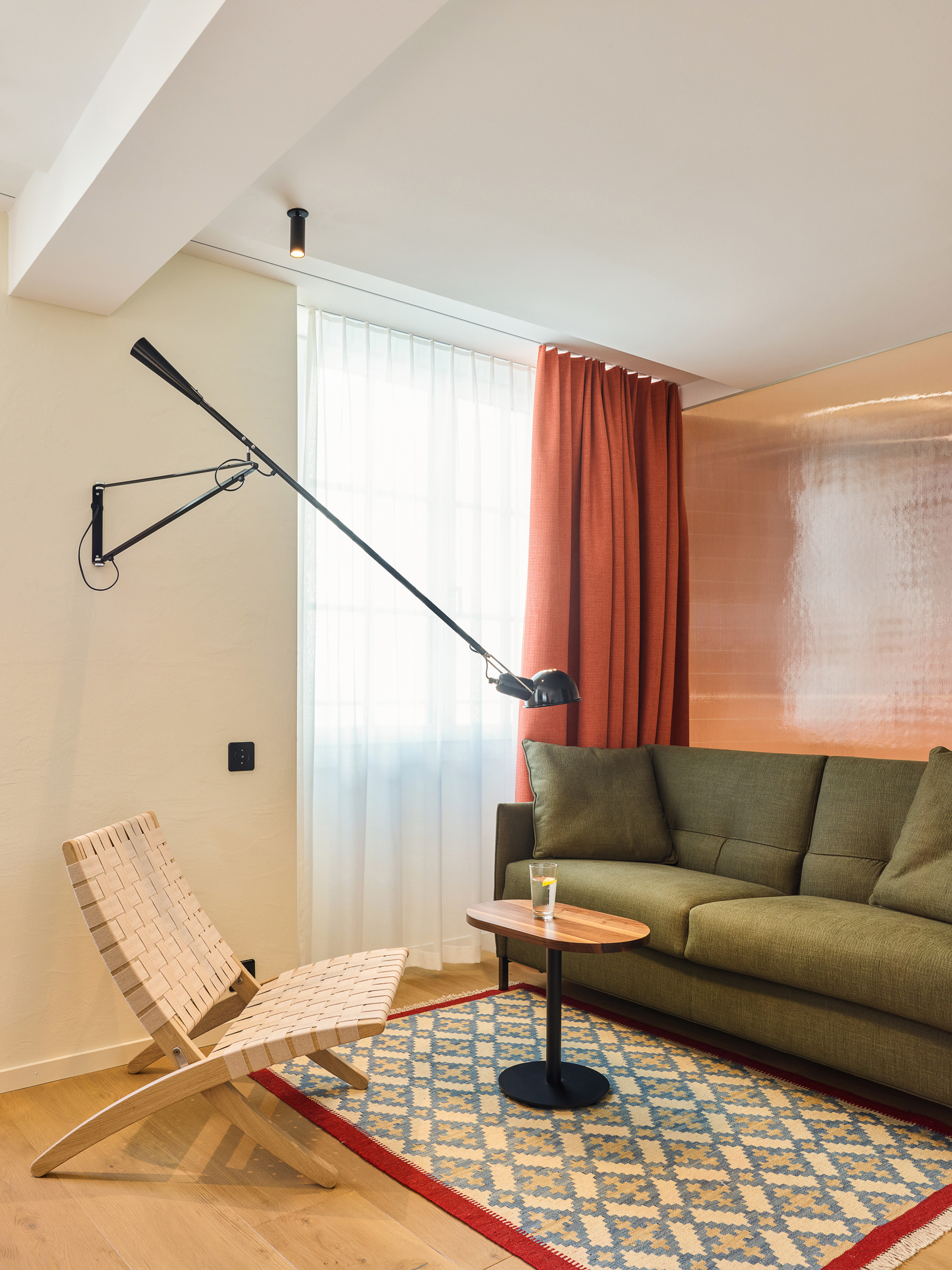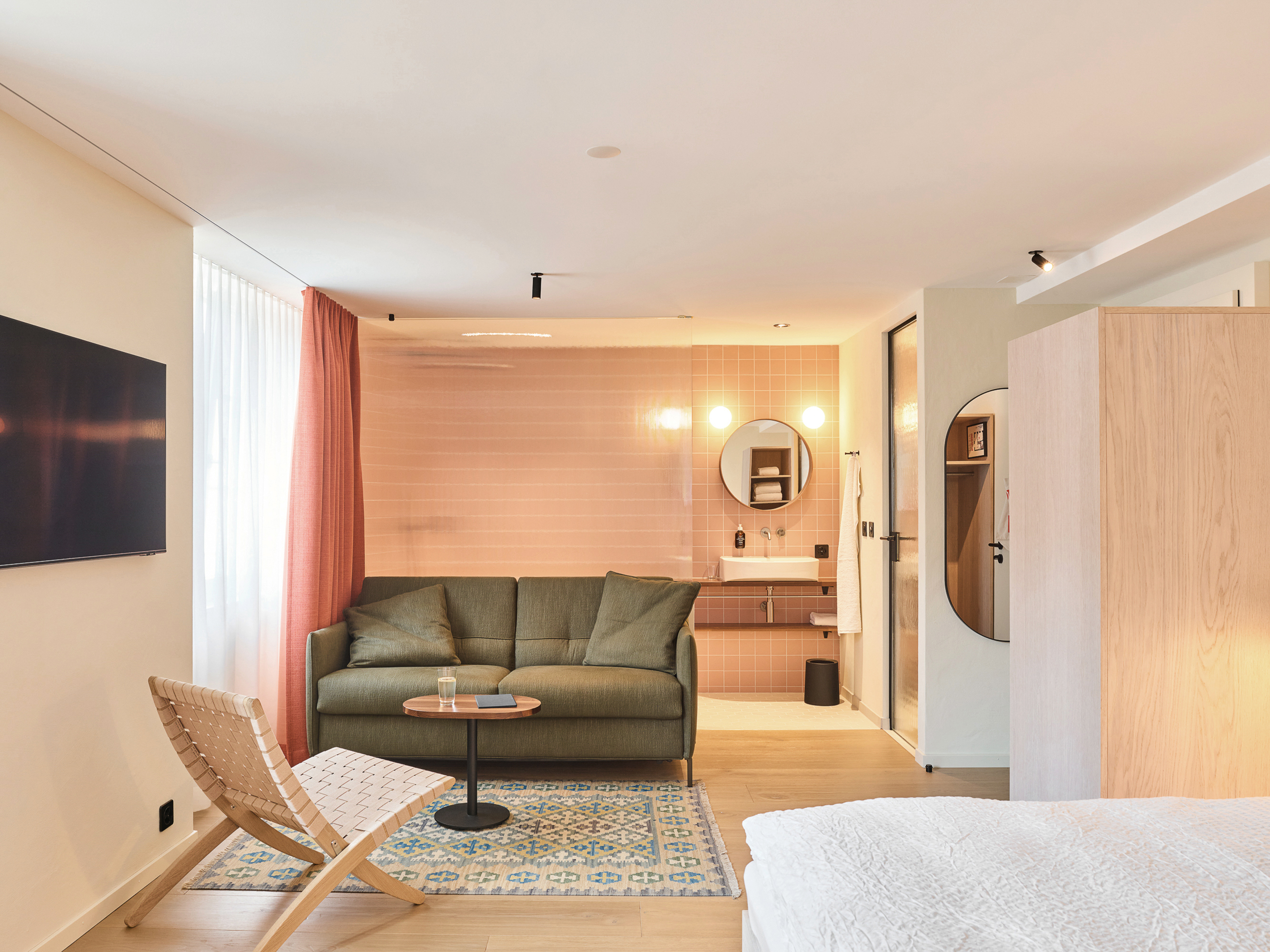 Die Schreinermöbel und die Materialisierung tragen die gleiche Handschrift wie das Café im Erdgeschoss, wo die Hotelgäste ihr Frühstück geniessen können.