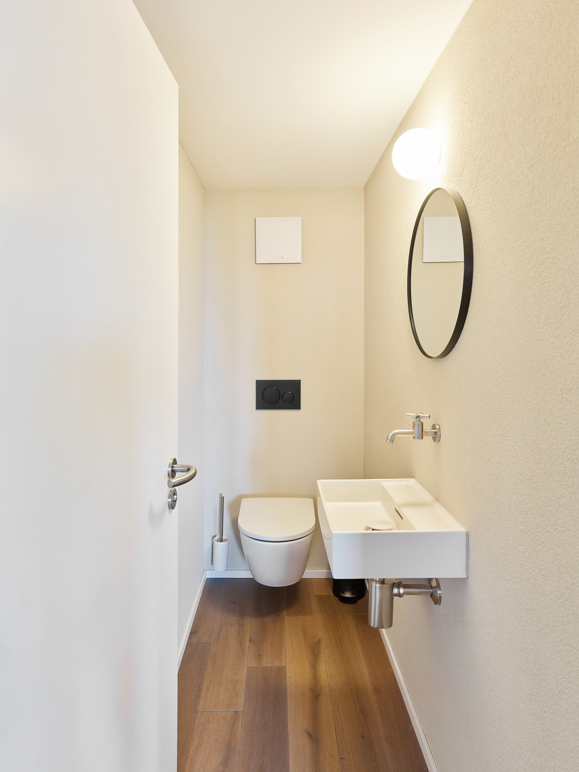In der Dachwohnung, die Platz für zwei Familien bietet, wird eine zusätzliche Toilette eingebaut. Zwei Schlafzimmer für die Eltern und der grosse Ess- und Wohnbereich unter Holzbalken werden im unteren Bereich eingerichtet, während auf der Galerie ein Massenlager und eine Spielzone für die Kinder entsteht.