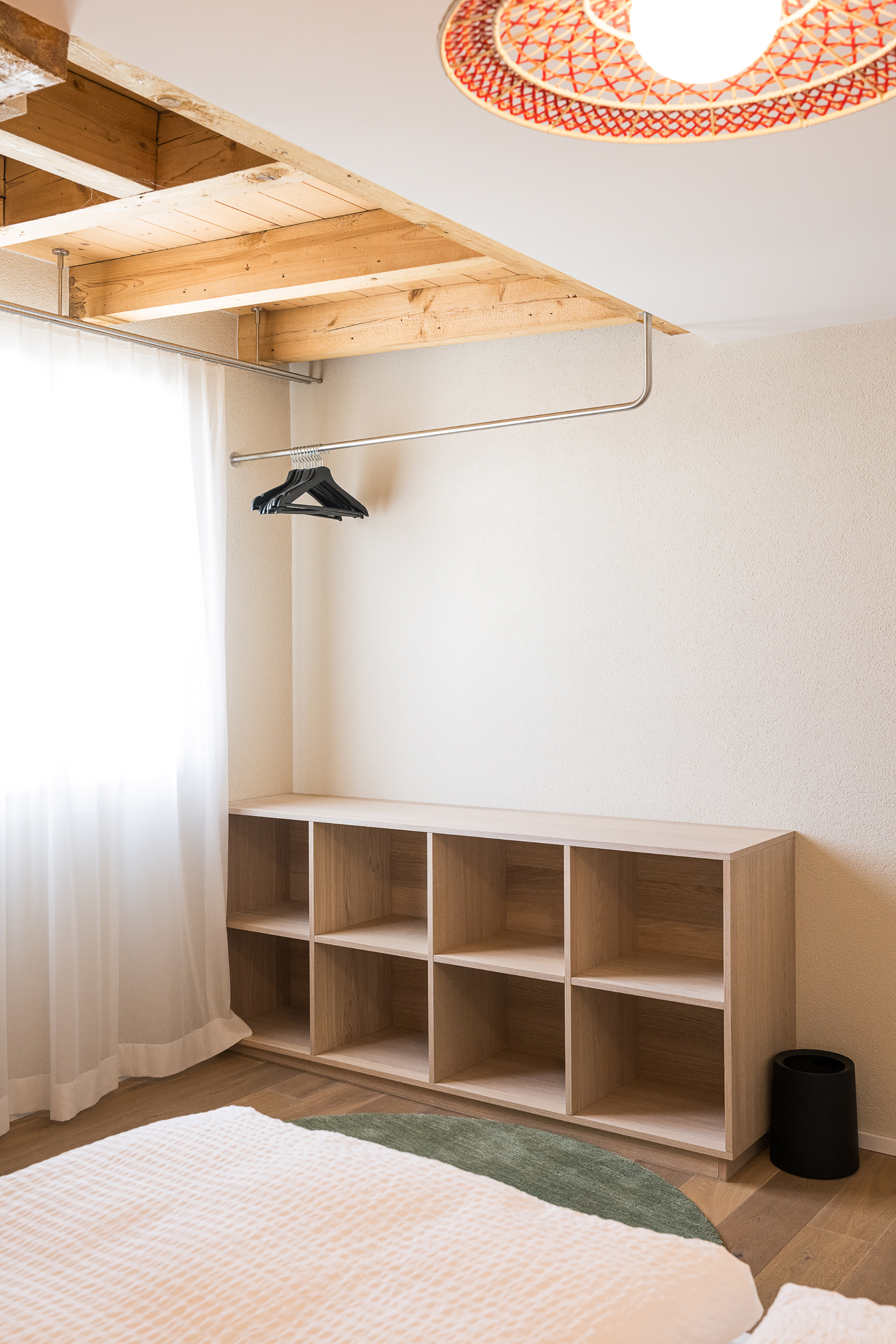 Die Wohnung im dritten Stock ist für vier Feriengäste konzipiert. Sie besteht aus einem grosszügigen Ess- und Wohnbereich sowie zwei Schlafzimmern mit eingebauten Betten und offenem Stauraum.